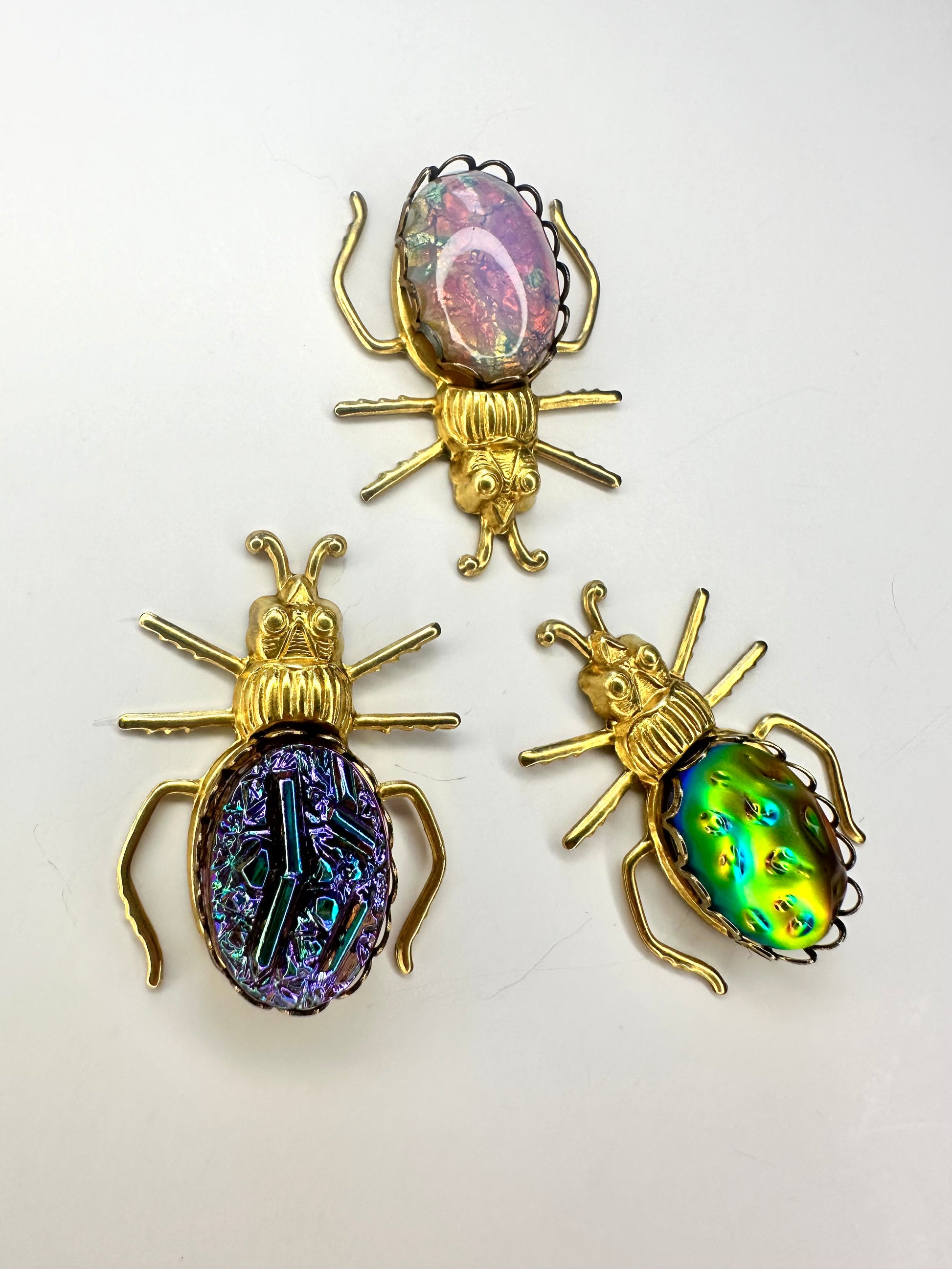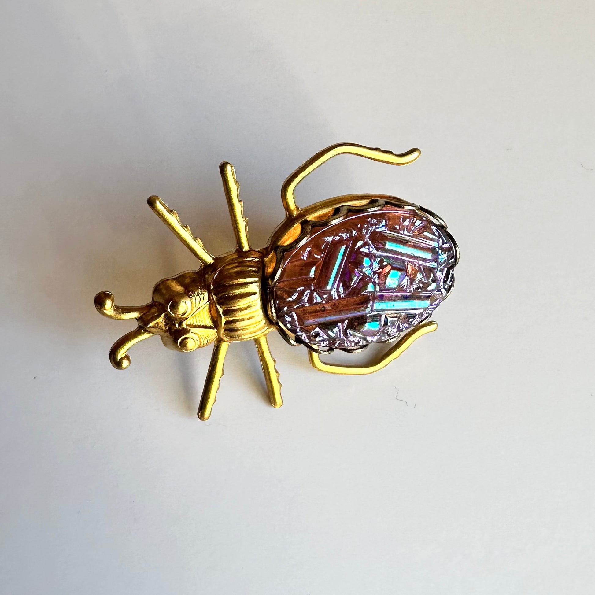 Vintage raw brass beetle with vintage Japanese iridescent amethyst glass stone from the 1940s-50s.